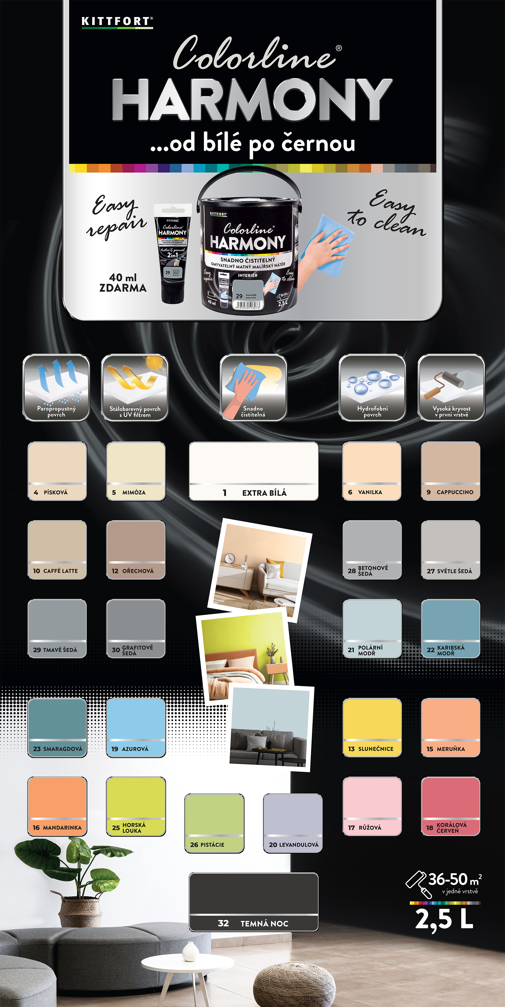 Colorline® HARMONY je moderní, inovativní, extra odolný, matný, omyvatelný malířský nátěr s hydrofobními vlastnostmi, které zaručují odolnost vůči vodě, nečistotám a skvrnám.